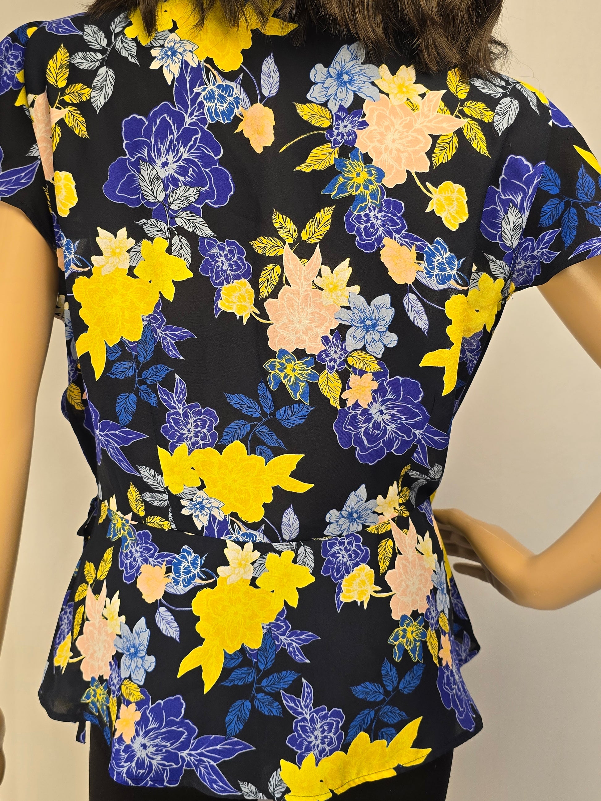 Banana Republic Blue Floral Top Flutter Sleeve Size Medium Preloved. Deep blue, light blue, pink and yellow floral. Approximate measurements: 15" or 38cm across waist, 16" or 41cm shoulder to waist, 7" or 18cm waist to hem, 14" or 36cm across shoulder. Tie inside and out to customize fit. Machine wash cold, tumble dry, low cool iron. Made in Indonesia.