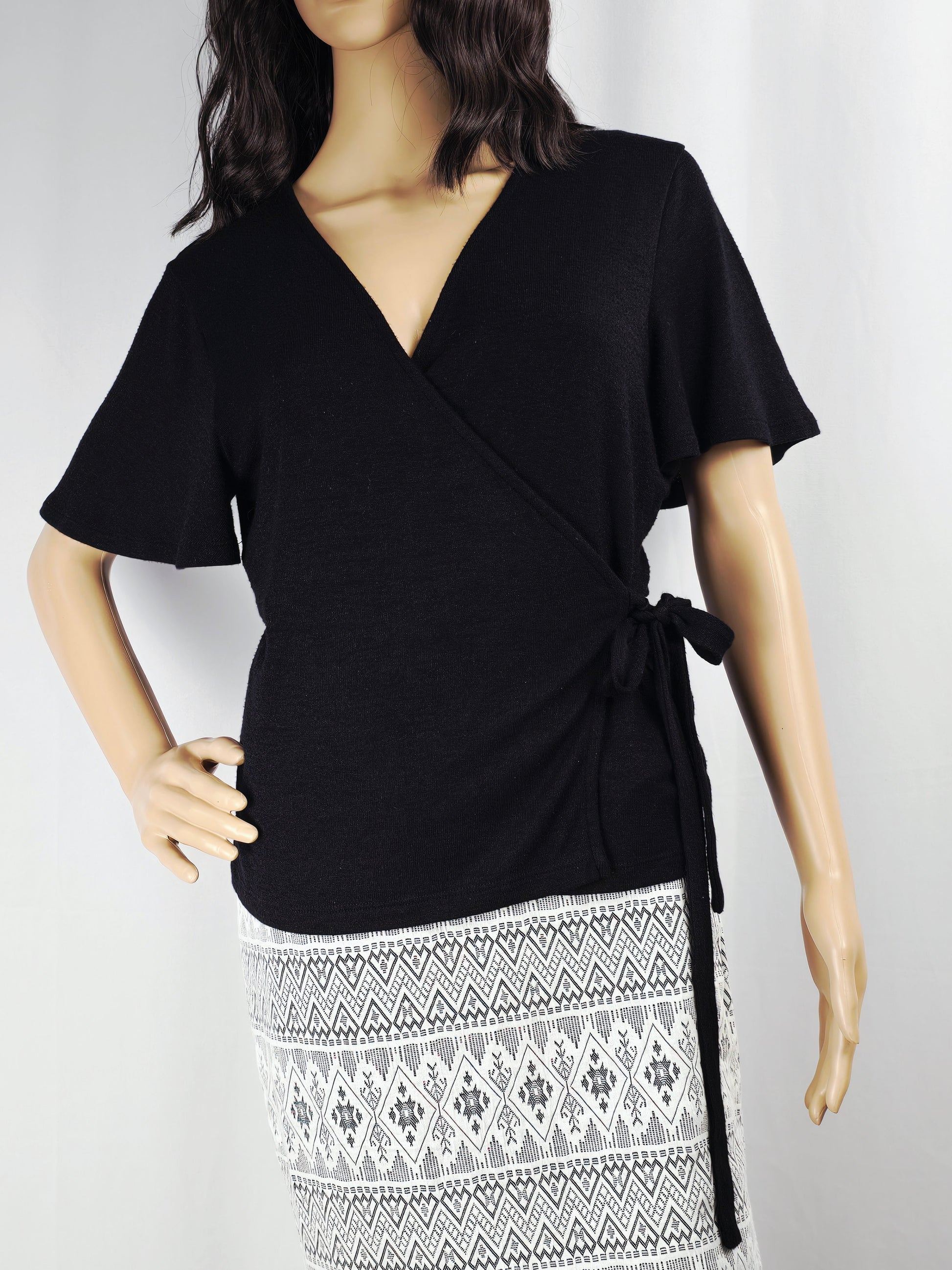 Gap Short Sleeved Wrap Sweater Top Medium Preloved. Flutter short sleeve. Approximate measurements: 15" or 38cm across waist where tied. 25" or 64cm shoulder to hem. 48% polyester, 48% rayon and 4% spandex. Machine wash cold, tumble dry low, cool iron. Made in Indonesia.