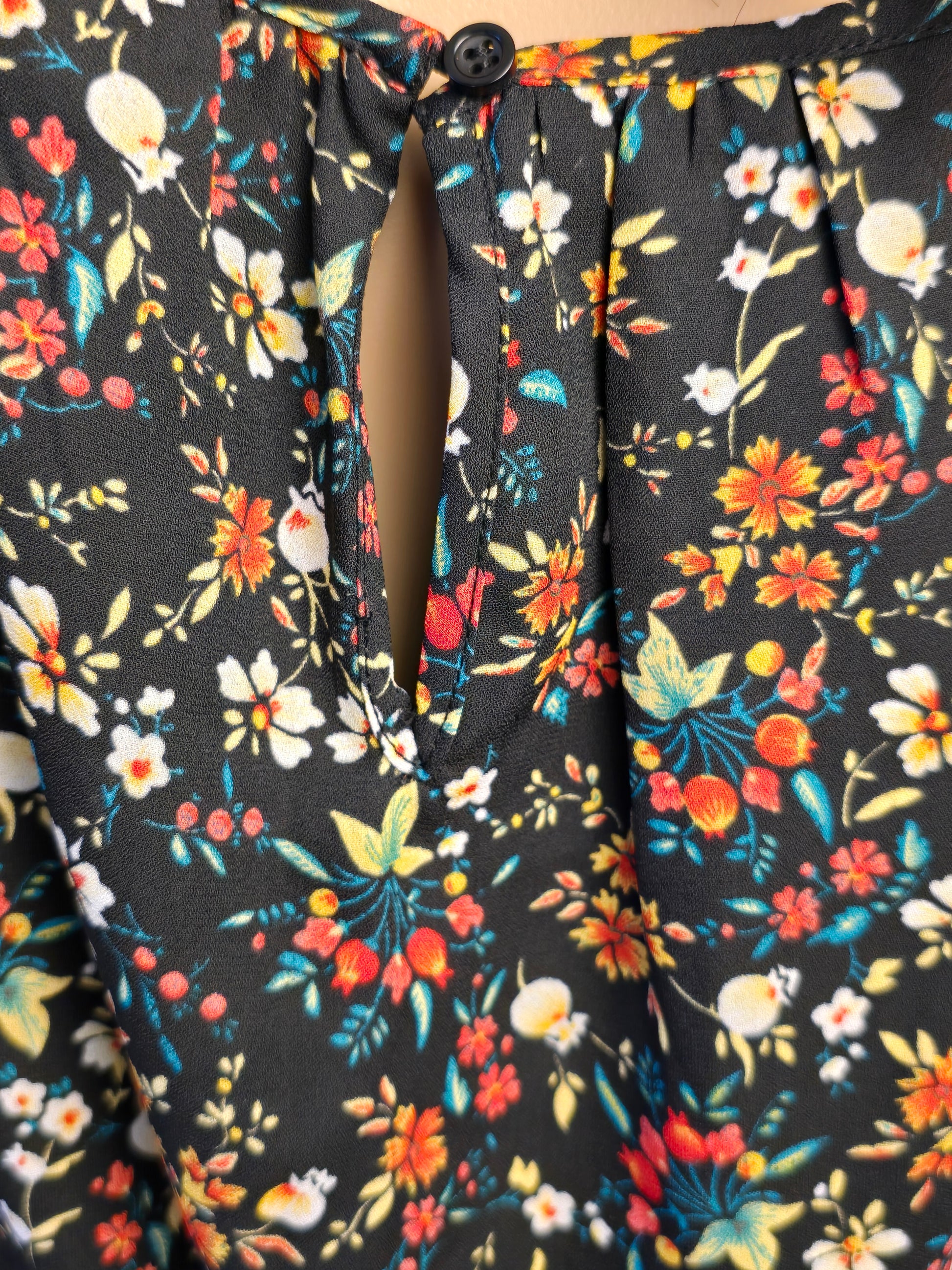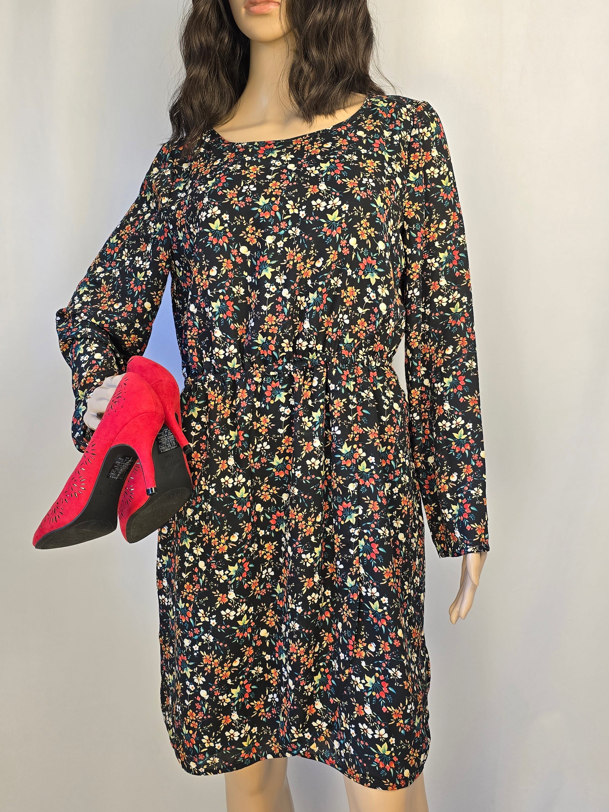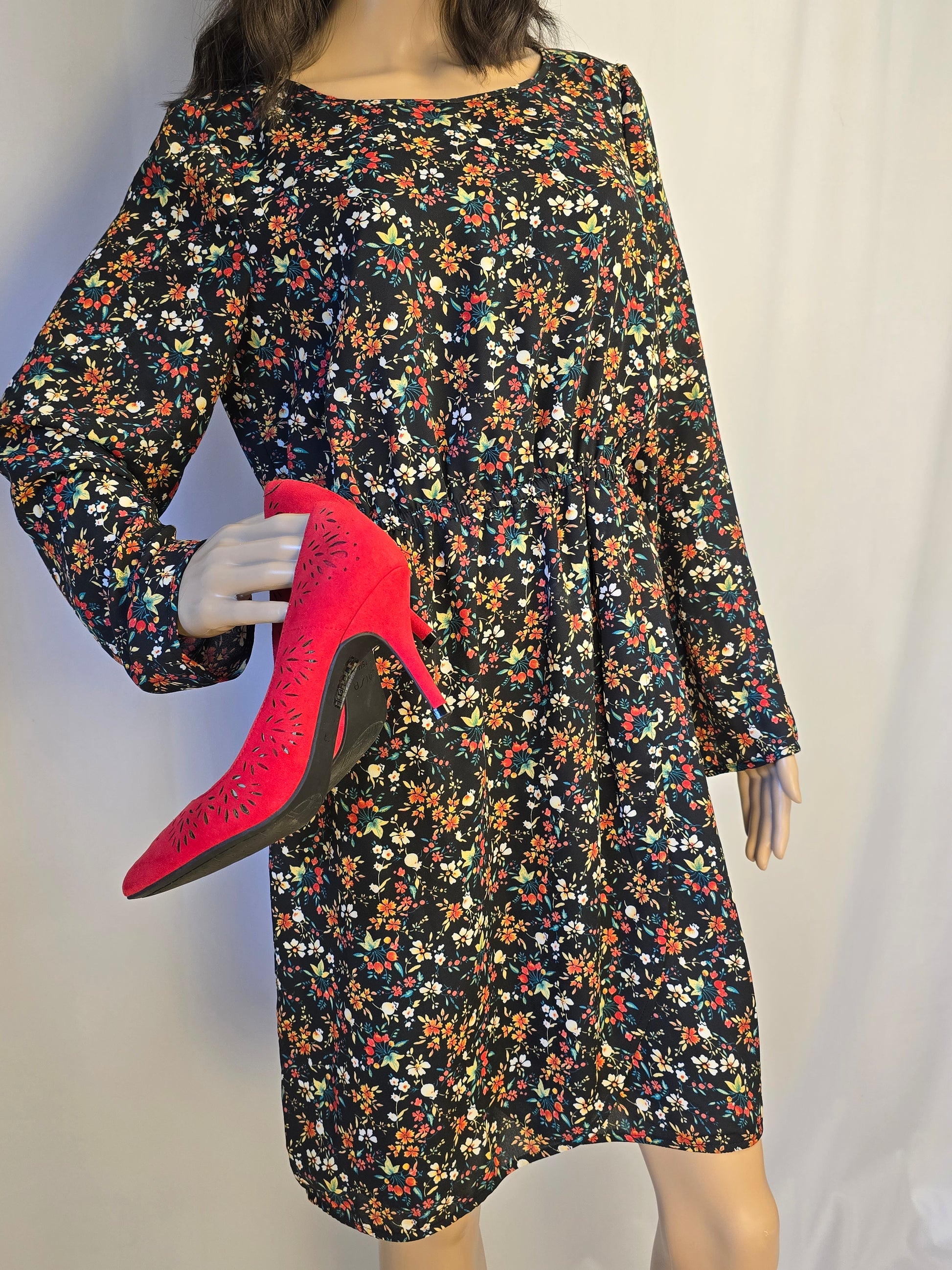 J. Crew Mercantile Floral Print Dress Size 8 Preloved. Stretchy elasticized waist. Pretty floral black, red, green, white and yellow. Wrap design skirt for interest. Approximate measurements: 15" or 38cm shoulder to waist, 15" or 38cm waist (stretches to 20" or 51cm), 17" or 44cm arm pit to wrist and 20" or 51cm waist to hem. 100% polyester shell and 100% polyester lining. Machine wash cold, tumble dry and warm iron. Shoes not included but are available on website. See unisa red suede heels.