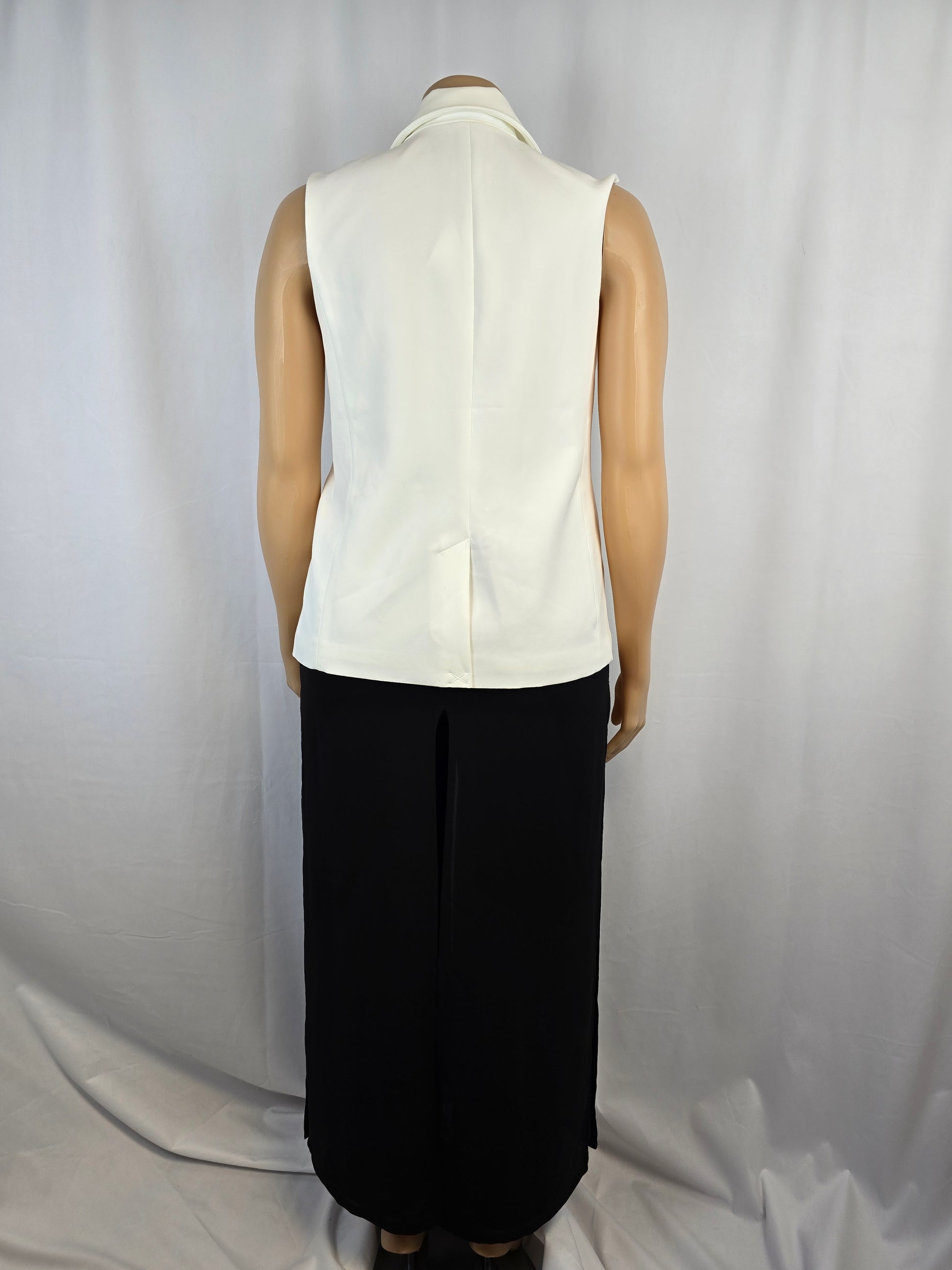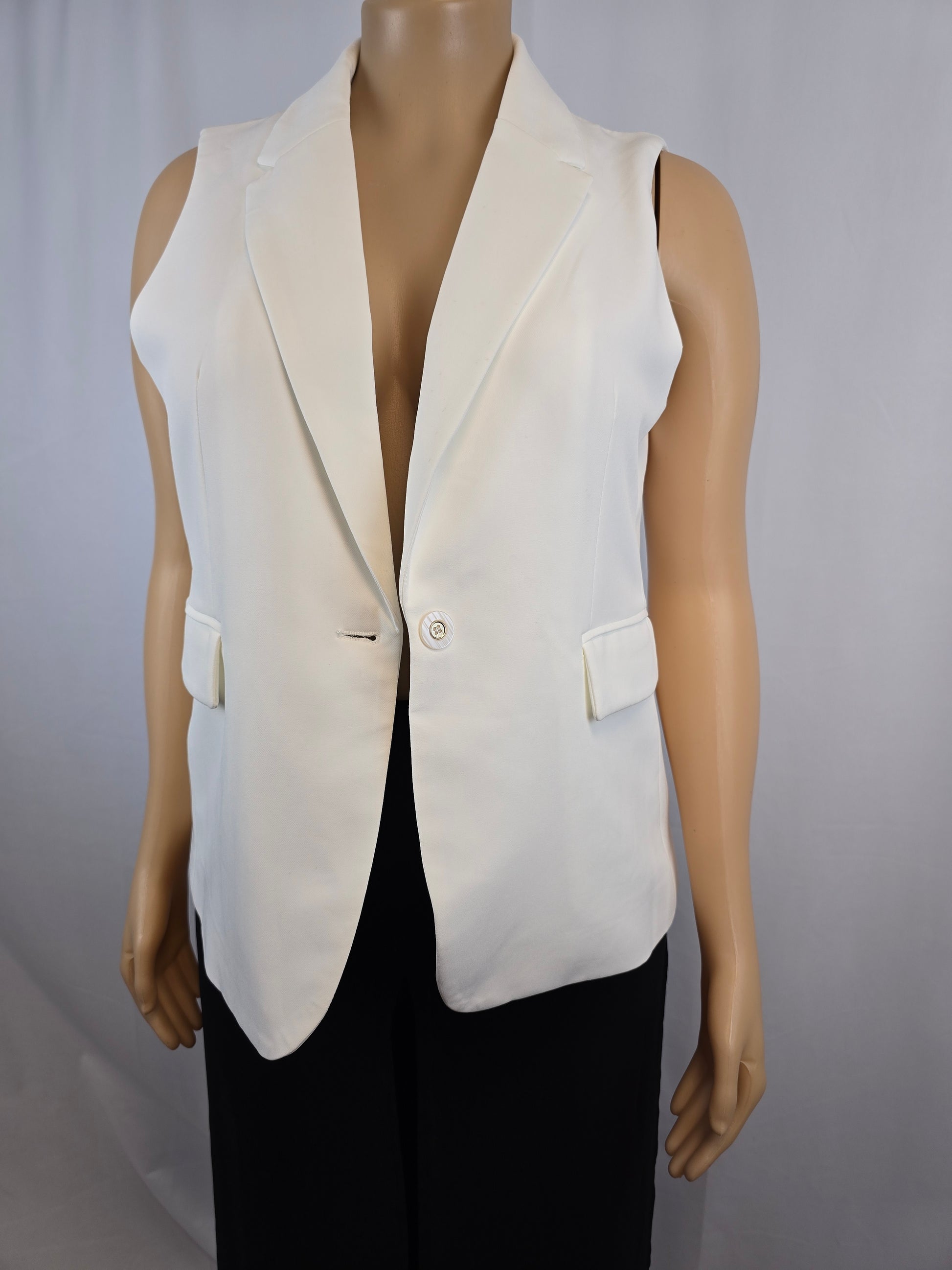 Joie White Vest XL New. Beautiful white vest perfect for summer with a shirt underneath or can be worn by itself. Please note that there are a few spots that are on the collar that can likely be sponged off. Please see pictures. New with tags. 90% Polyester 10% spandex lining 94 Polyester 6% Spandex. Paid $39.00. Selling for $30.00.