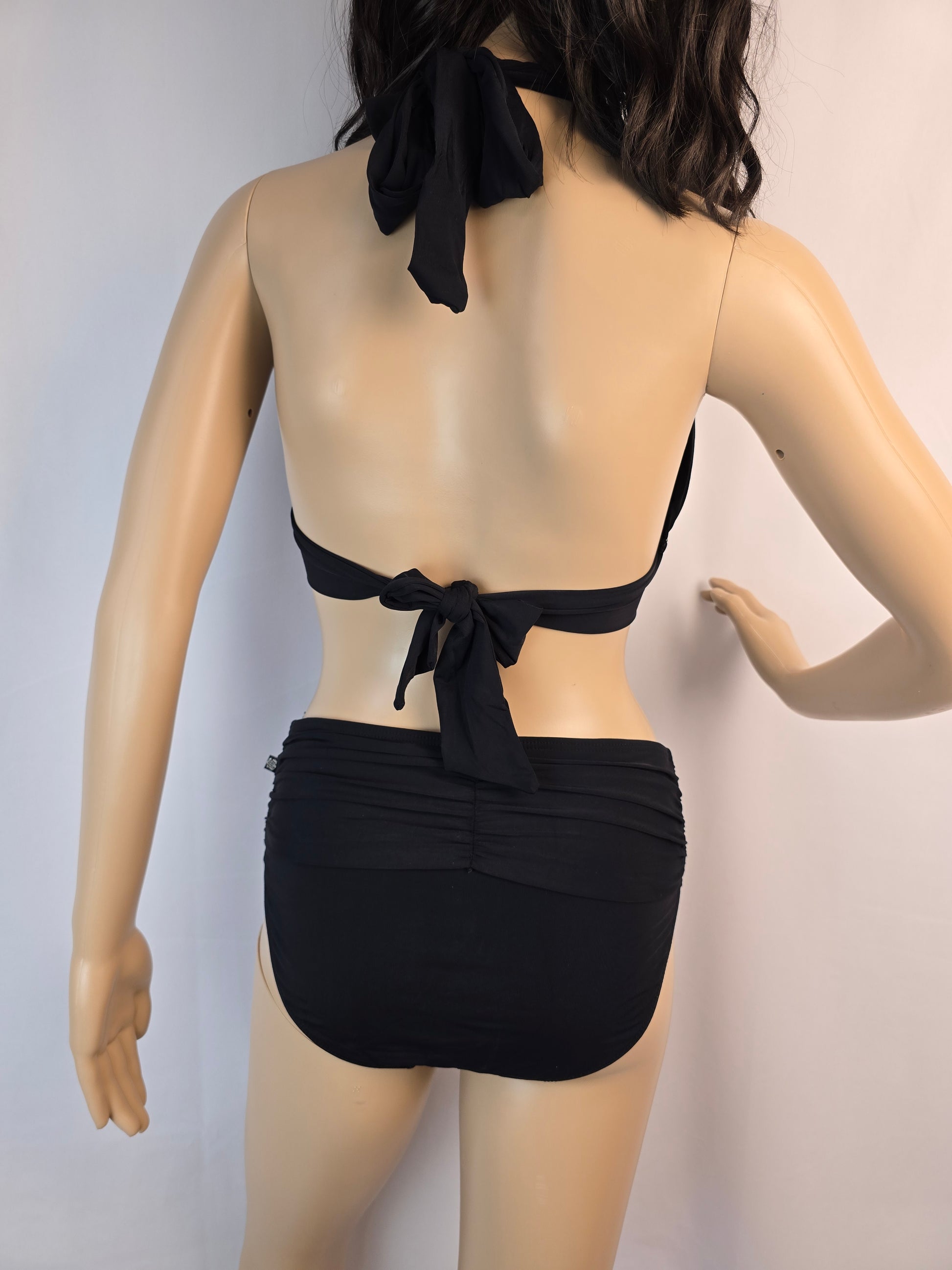 La Vie En Rose Bikini Top and Bottom Preloved. Black. Top size large bottom size medium. Halter top with two ties in back. Bottom has gathered design with metal ring in front. Excellent condition.