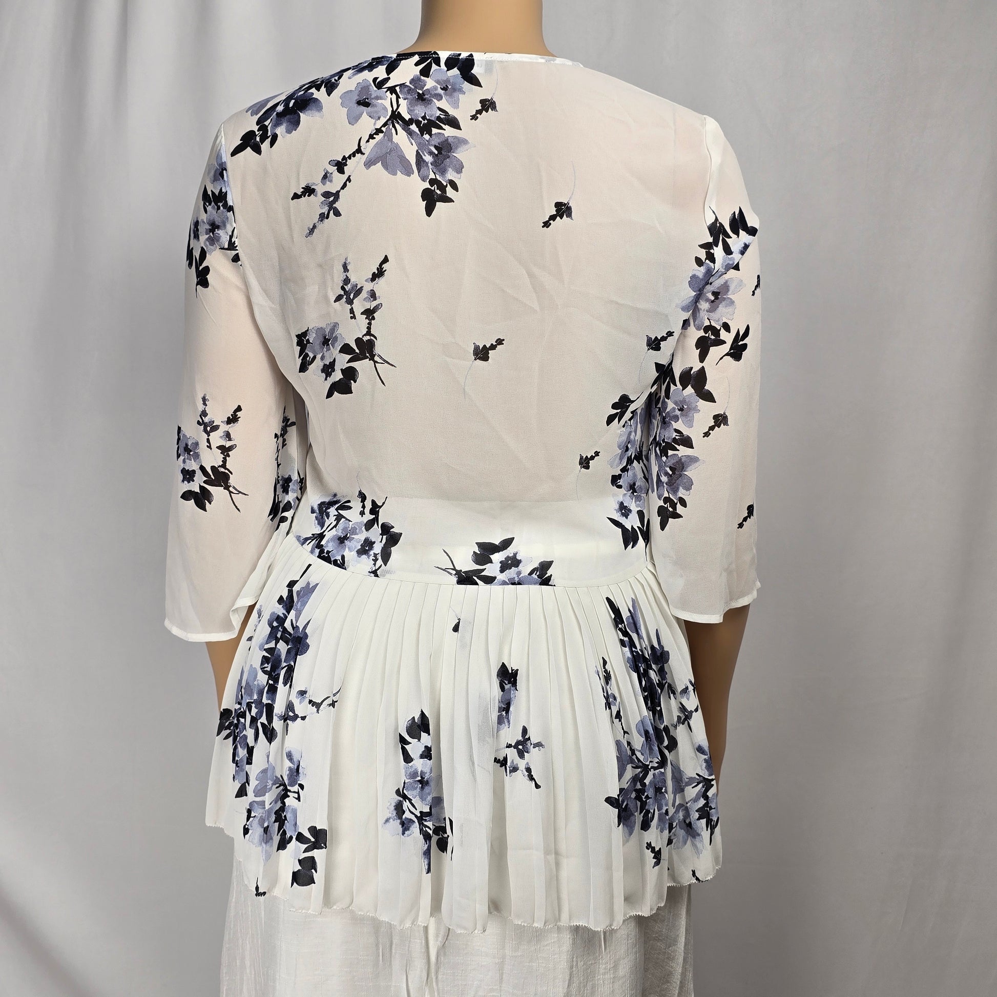 Le Chateau White Gray Floral Large Preloved. Lovely sheer blouse for any season. For modesty, you will want to wear a tank top underneath as quite sheer (not included). Button detail in front, pleated hi-lo bottom of shirt. 3/4 sleeves. Machine wash inside out. 100% polyester. Made in China.