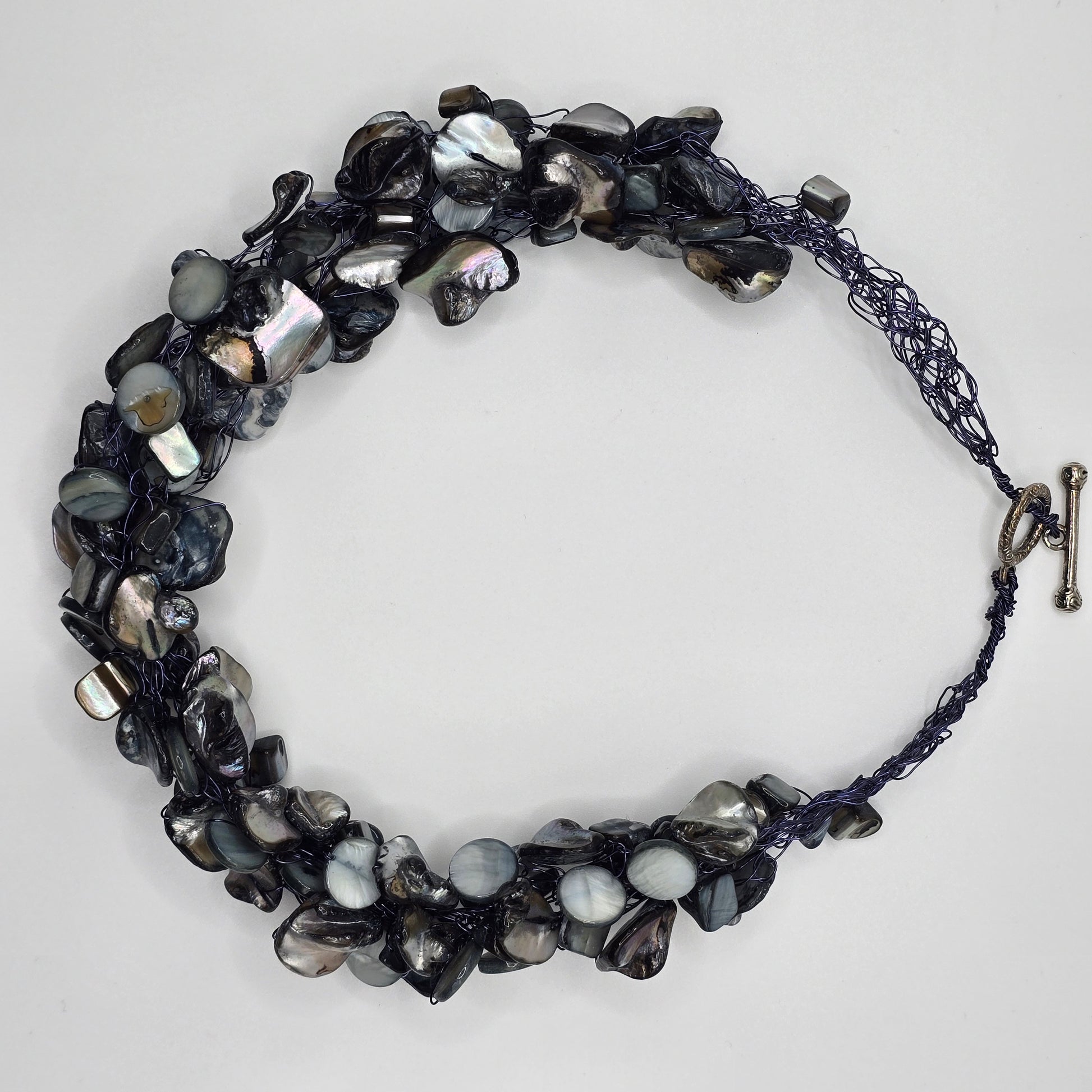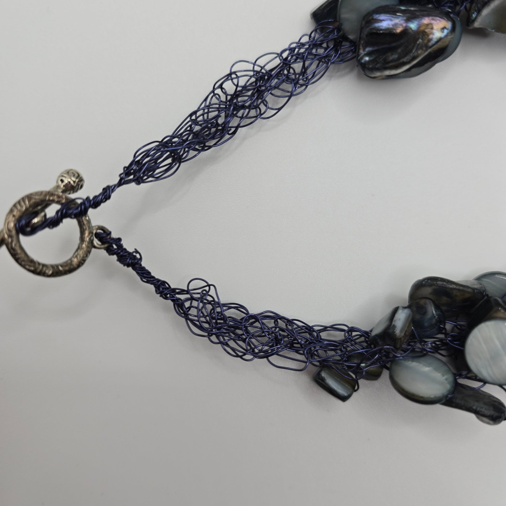 Mother of Pearl Chunky Necklace Preloved. Stunning, iridescent, blue, grey necklace. Approximately 19" or 48cm in length. 1.5" or 3cm in width. It is a definite statement piece. Webbing design with toggle closure.