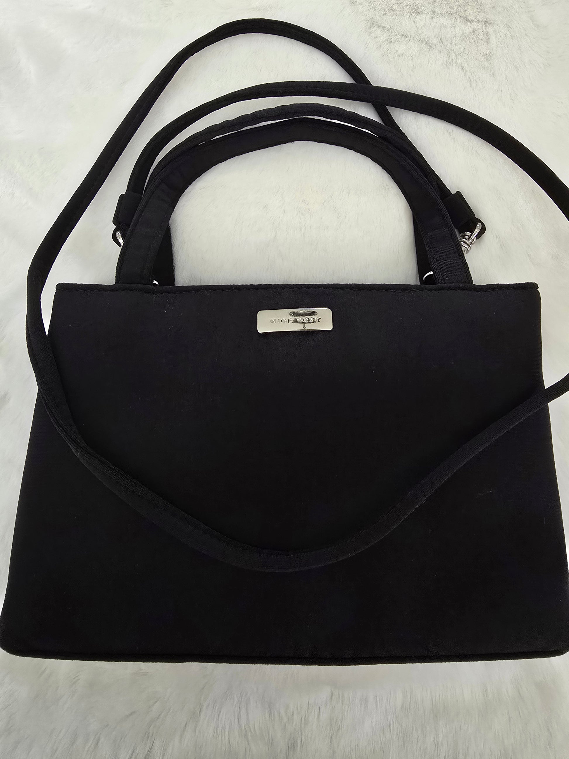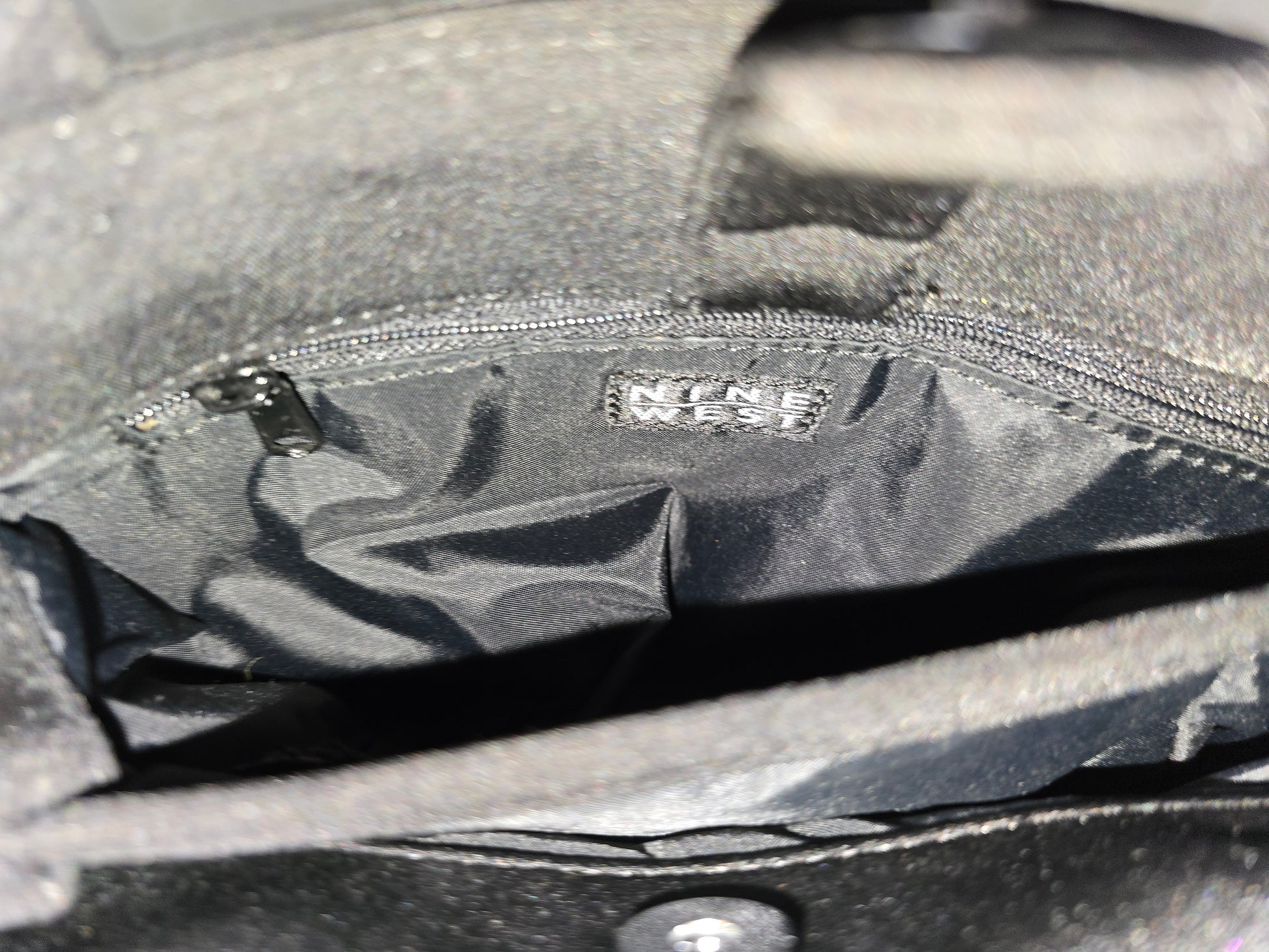 Nine West black fabric mini handbag with shoulder strap. Preloved. Perfect for night out on the town, an evening purse for a cruise or resort. Magnetic closure. Great condition. 8.5 inches / 21cm width and 5.5 inches / 14cm height.