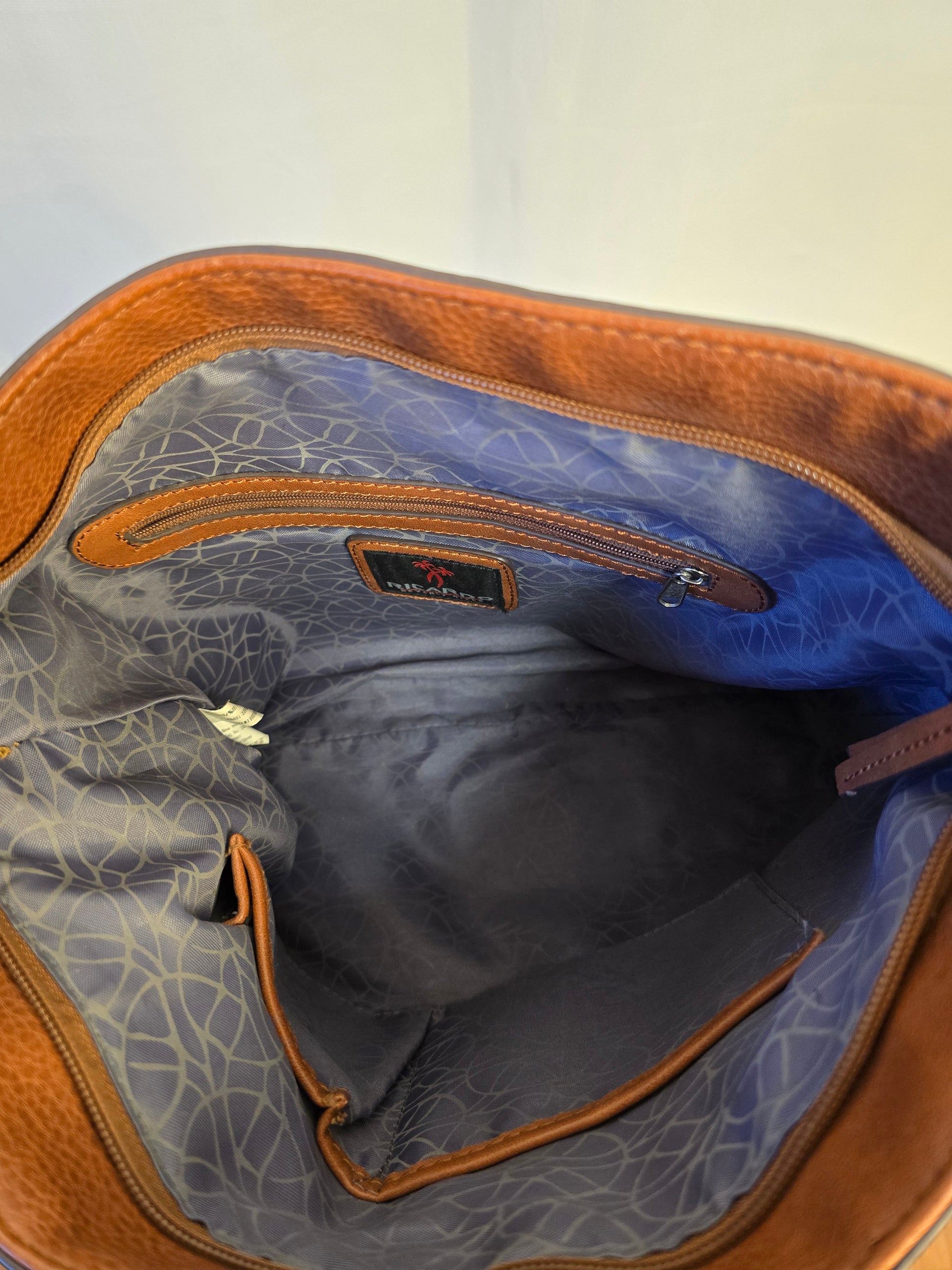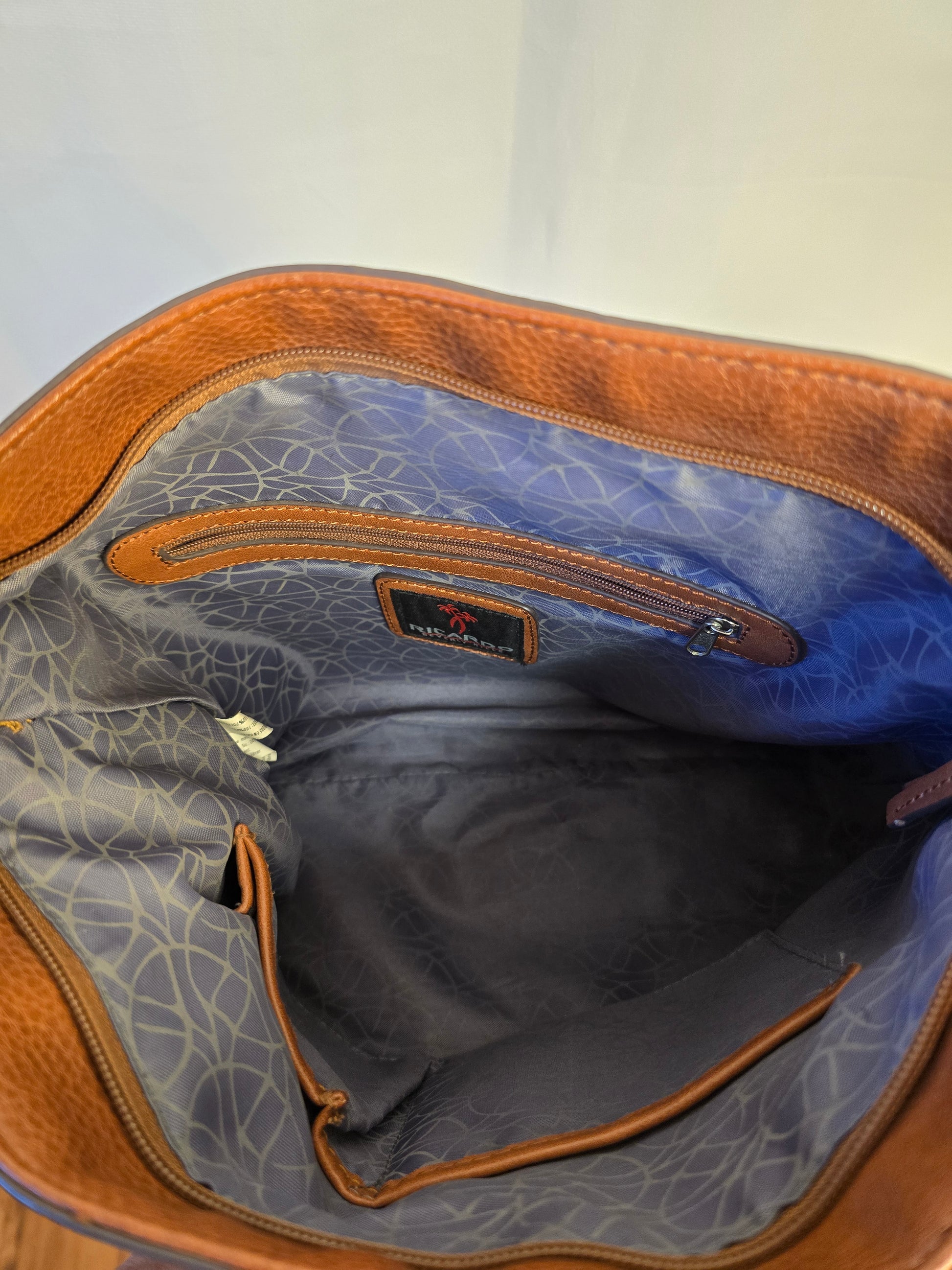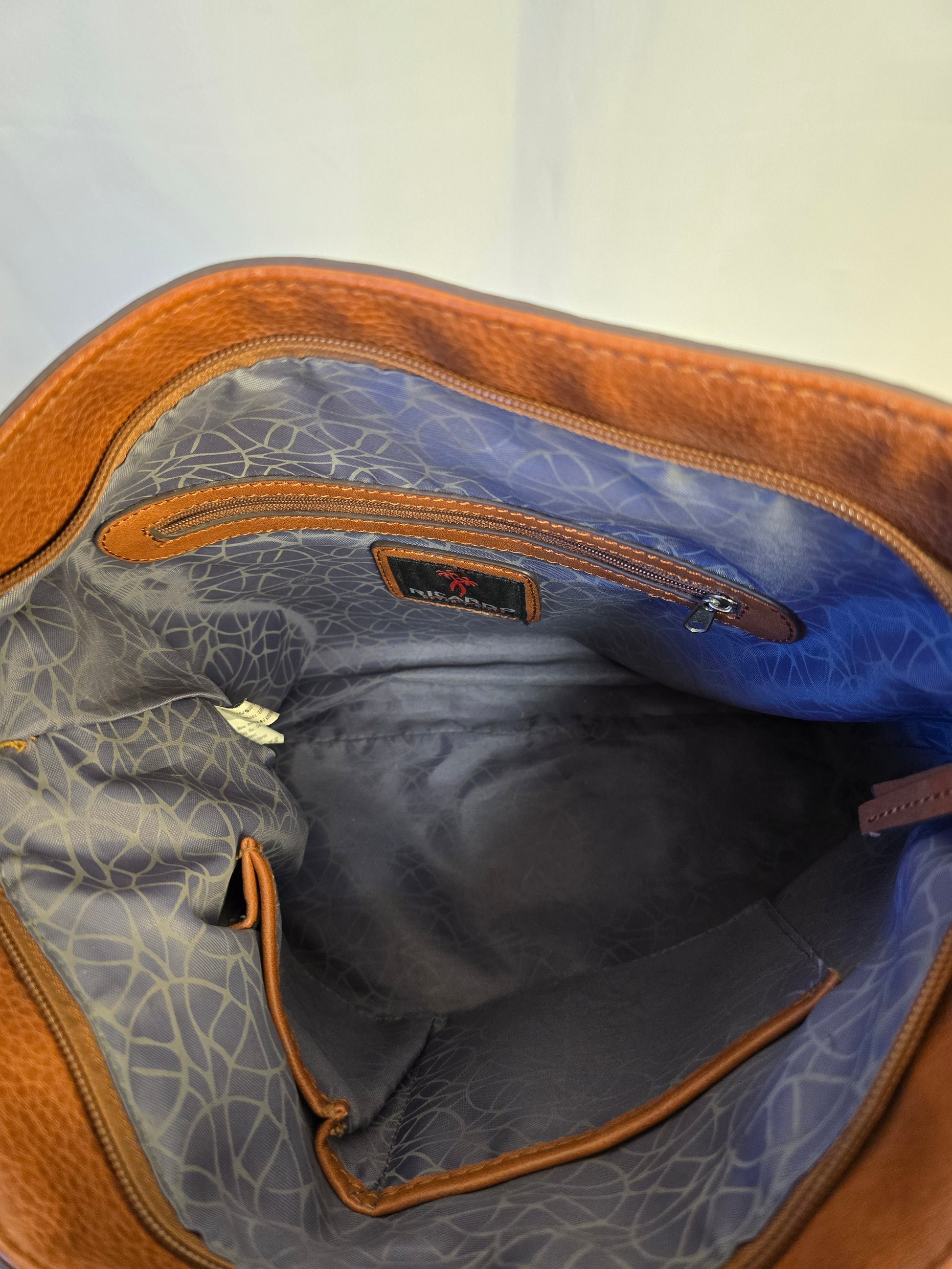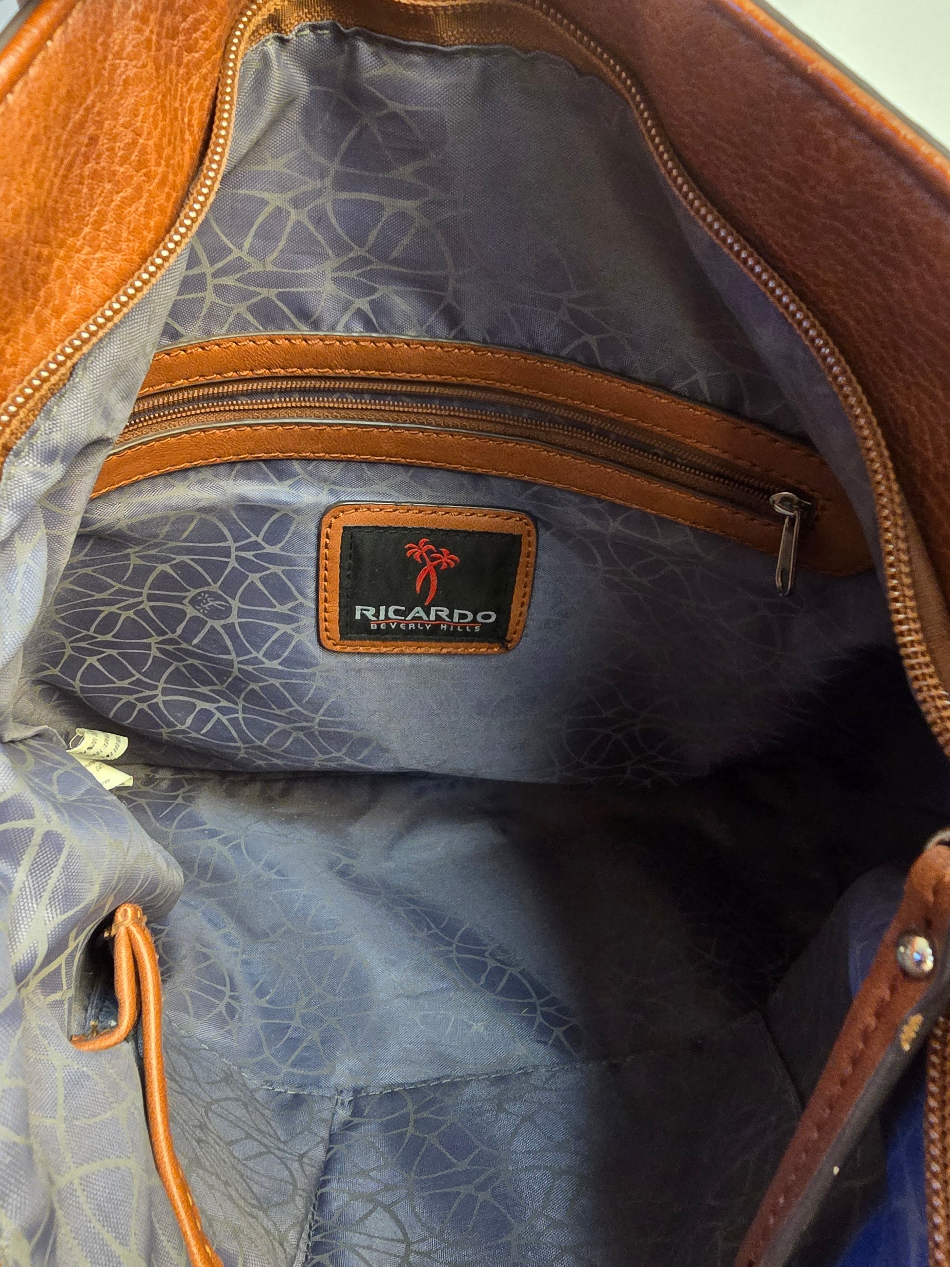 Beautiful Ricardo Beverly Hills Purse. Dual straps with removable crossbody strap. Spacious interior with loads of pockets. Top and front zip pockets which make it the perfect travel companion. Wear on ring holders on side of bag noted in picture. Otherwise, a great bag that has tons of stylish life left. Exterior pvc interior polyester. ~12" x 14" x 4". 30cm x 36cm x 10cm.