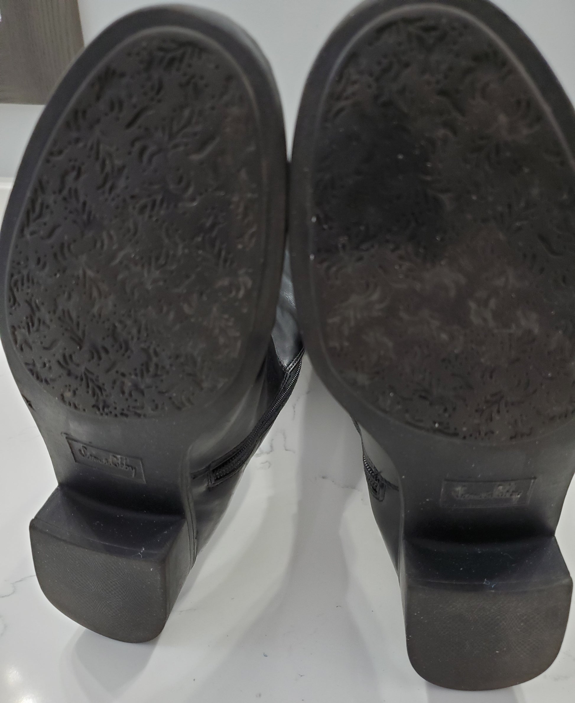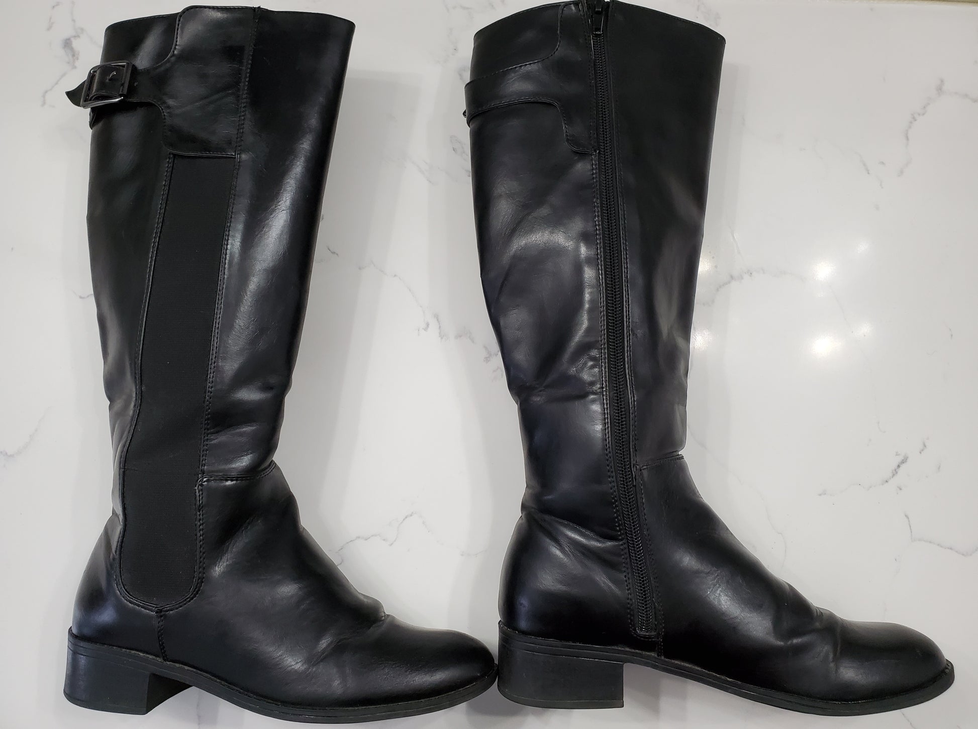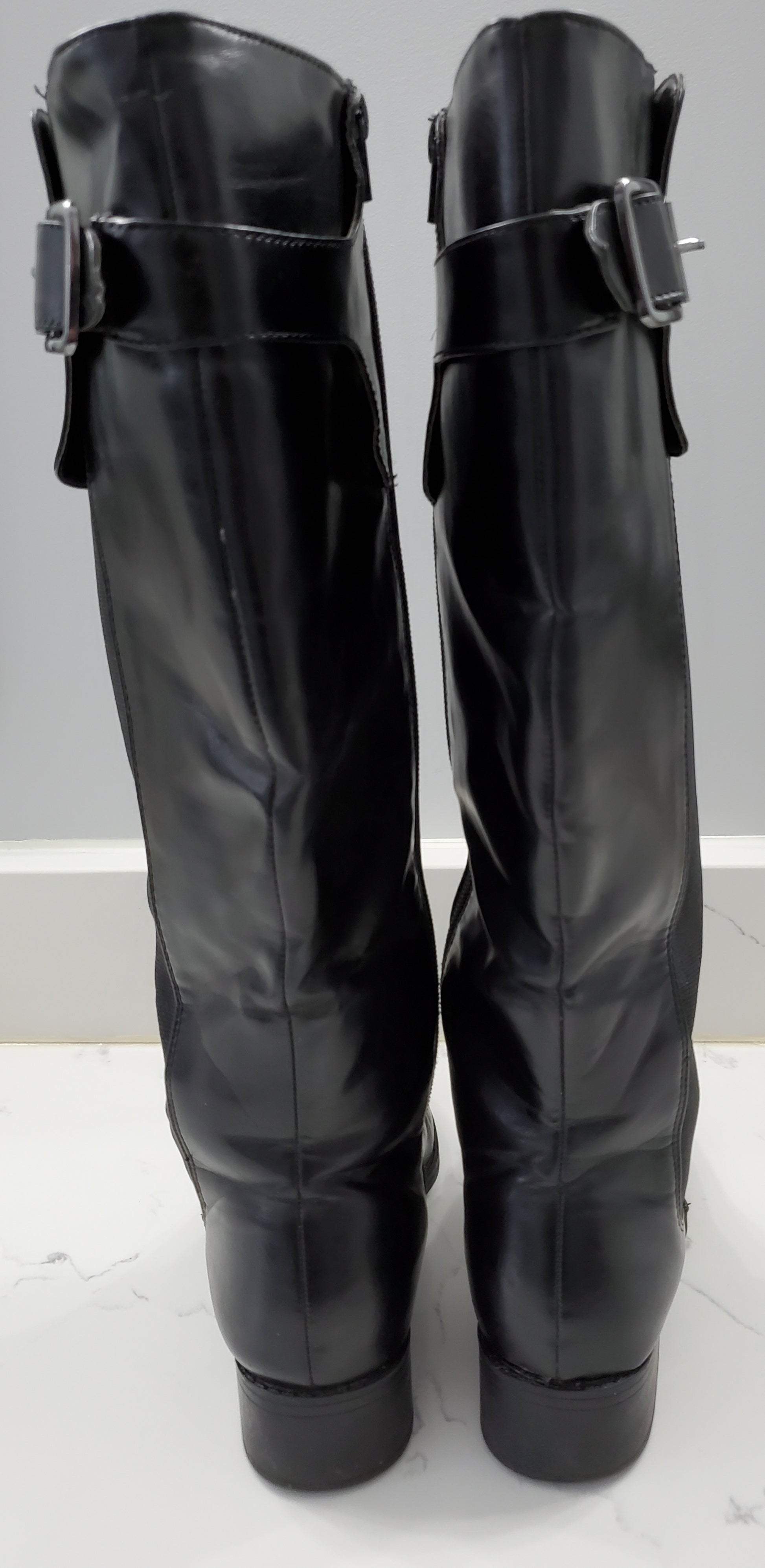Sam & Libby black riding style boot. Slaselia is name of boot from inside. Adjustable buckle detail on calf. Fabric inset on side of each boot. Size 7.