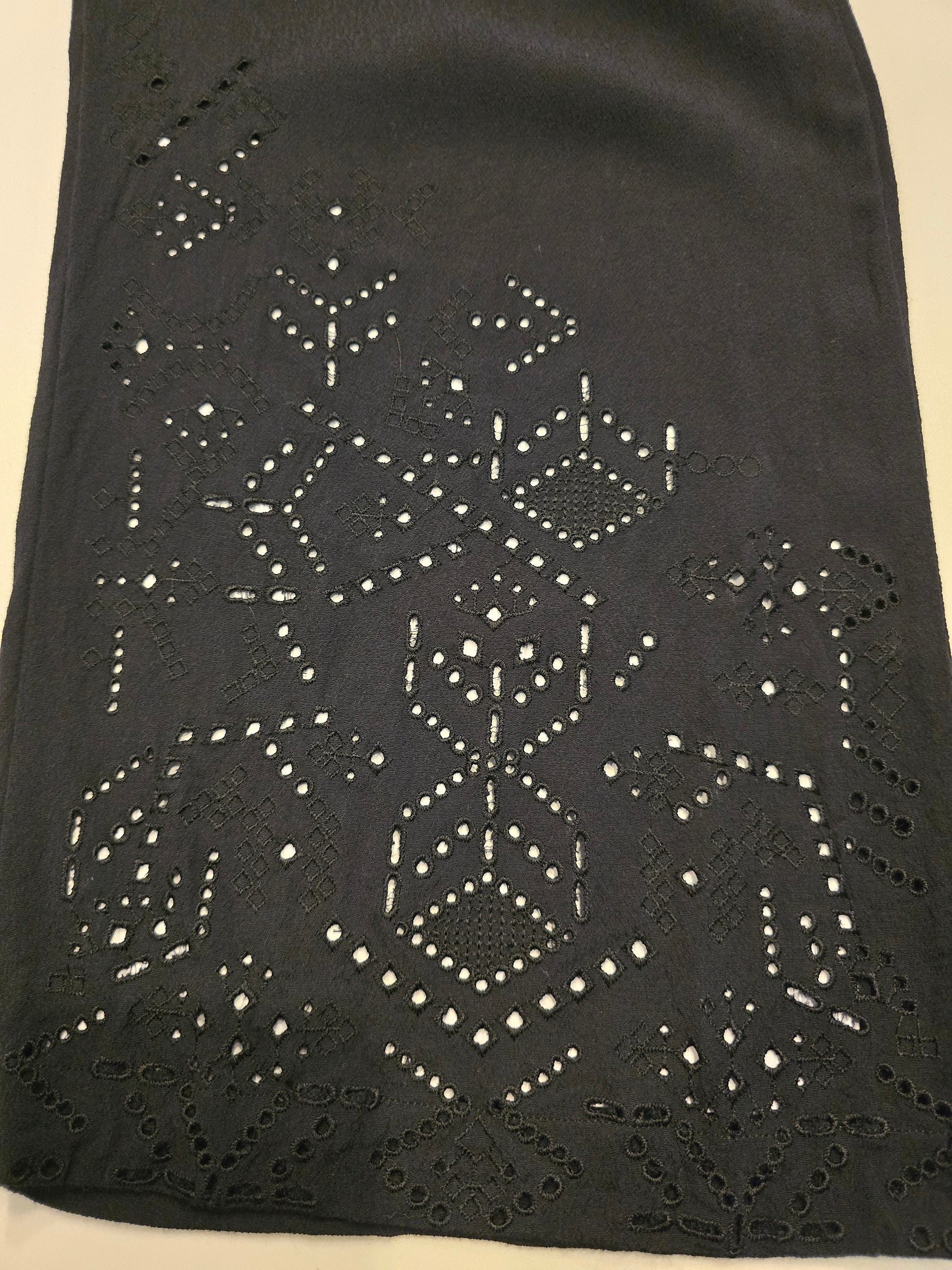 Tribal Black Pull-On Pant with Laser Cutout Front Bottom Size Large Preloved. Excellent condition! These are a perfect pant for travel or a night out on the town. Wide style leg. Comfort is elevated with the elastic waist and side pockets. Machine wash delicate cycle cold water. Line dry. 52% Rayon 48% Viscose.