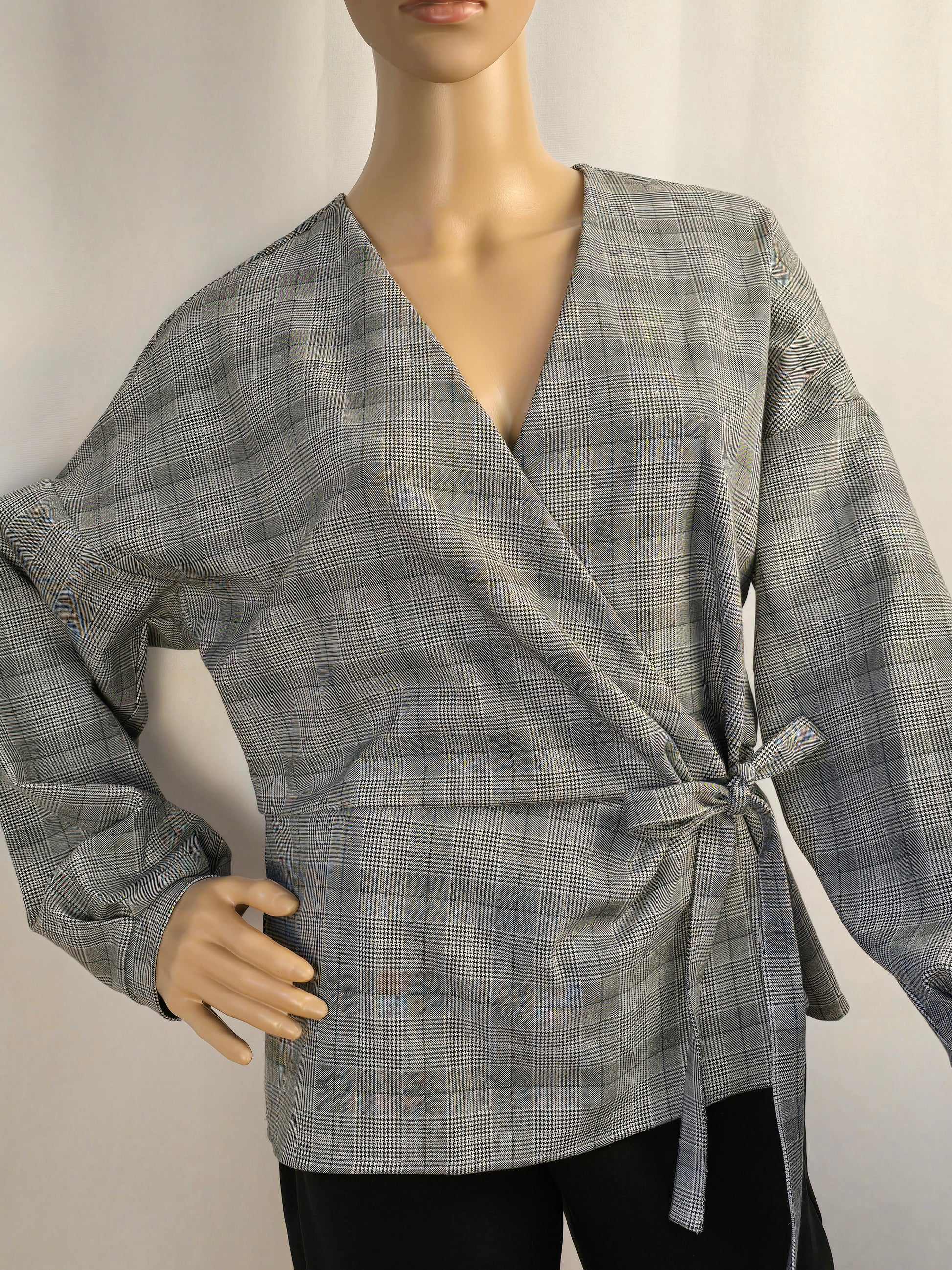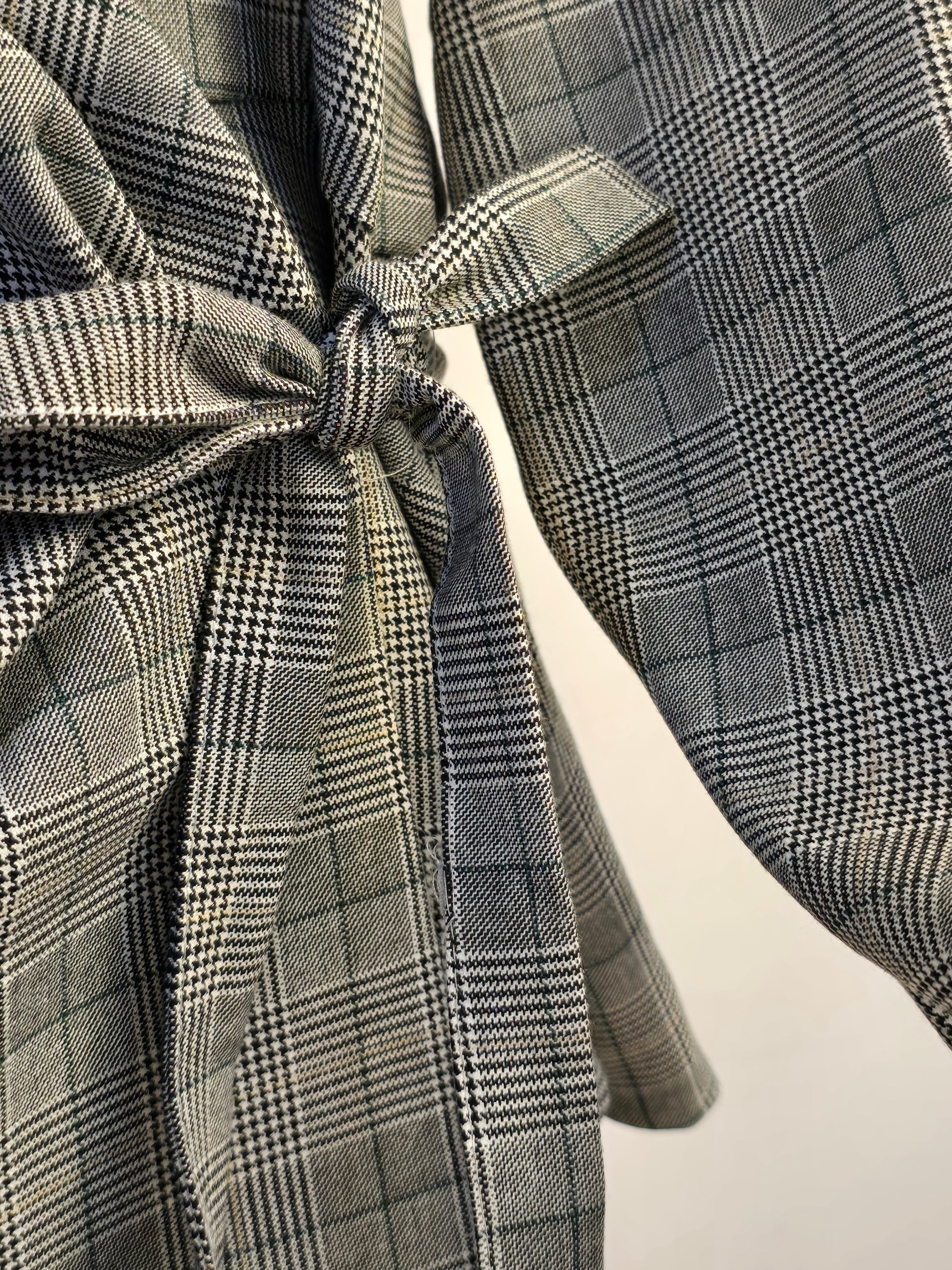Zara Woman Plaid Blazer Large Preloved. Classy, timeless, plaid jacket (grey, black, green stripe). Sleeve has interest with a pleat near shoulder and cuff at wrist. Drop shoulder. Approximate measurements: 16" or 41cm shoulder to waist. 15" or 38cm across waist at tie. 7.5" or 19cm from waist to hem. 64% polyester, 32% viscose, 4% elastane. Machine wash, hang to dry, cool iron.